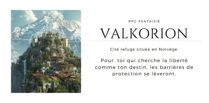 Bâtie sur l’une des montagnes surplombant Trolltunga, la cité circulaire de Valkorion est une cité qui se voulait être la perfection.Marbre blanc, dorures, abondance de tous les luxes, là était la promesse qui poussa bien des individus à partir en direction de la ville légendaire.La cité est accessible par deux principales voies, les deux étant au même endroit, au pied de la montagne, là où deux cascades, naissant des fleuves éternels qui parcourent la ville, se laissent tomber.